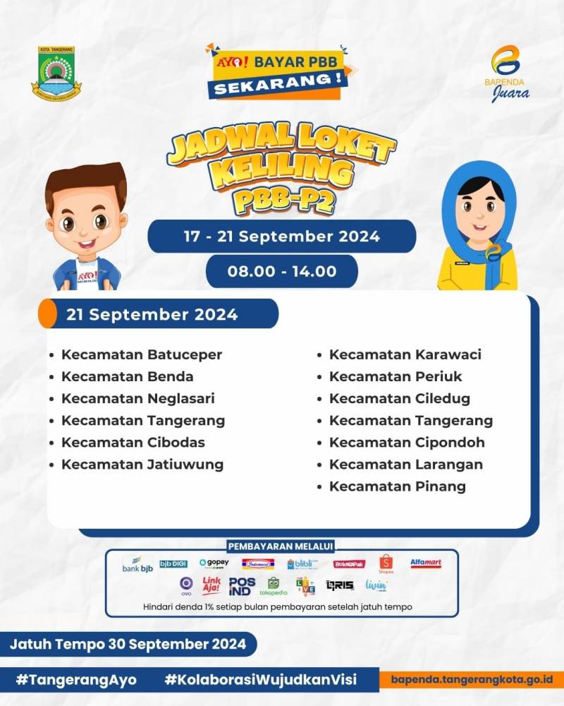 Pemerintah Kota (Pemkot) Tangerang melalui Badan Pendapatan Daerah (Bapenda) menggelar Loket Keliling PBB-P2 di tiap kelurahan dan kecamatan di Kota Tangerang dari 17 hingga 21 September 2024.