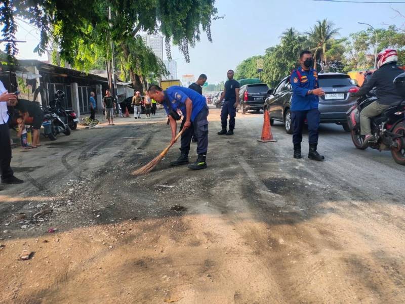 Ia pun menjelaskan, penanganan dilakukan secara simultan. Yakni, DPUPR dengan menebar pasir di seluruh tumpahan oli, lalu BPBD melakukan penyemprotan, DLH dengan petugas kebersihannya membantu proses pembersihan jalan.