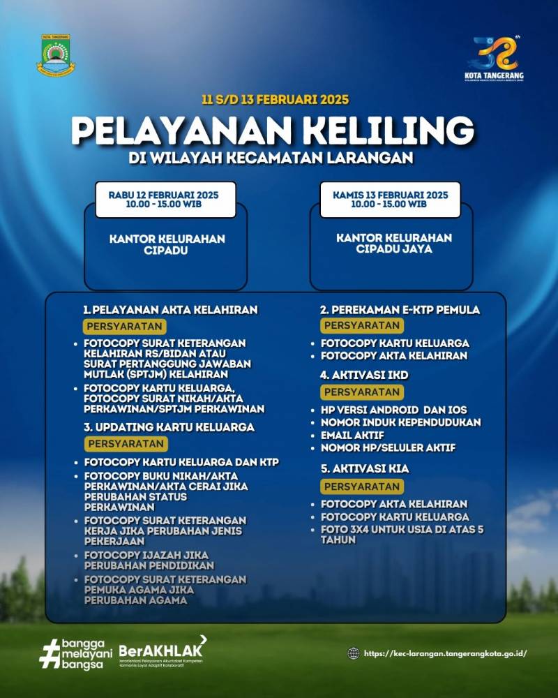 Dalam rangka memeriahkan Hari Ulang Tahun (HUT) ke-32 Kota Tangerang, Kecamatan Larangan bersama Dinas Kependudukan dan Pencatatan Sipil (Disdukcapil) berkomitmen u tuk memudahkan dan mendekatkan pelayanan administrasi kependudukan kepada masyarakat.