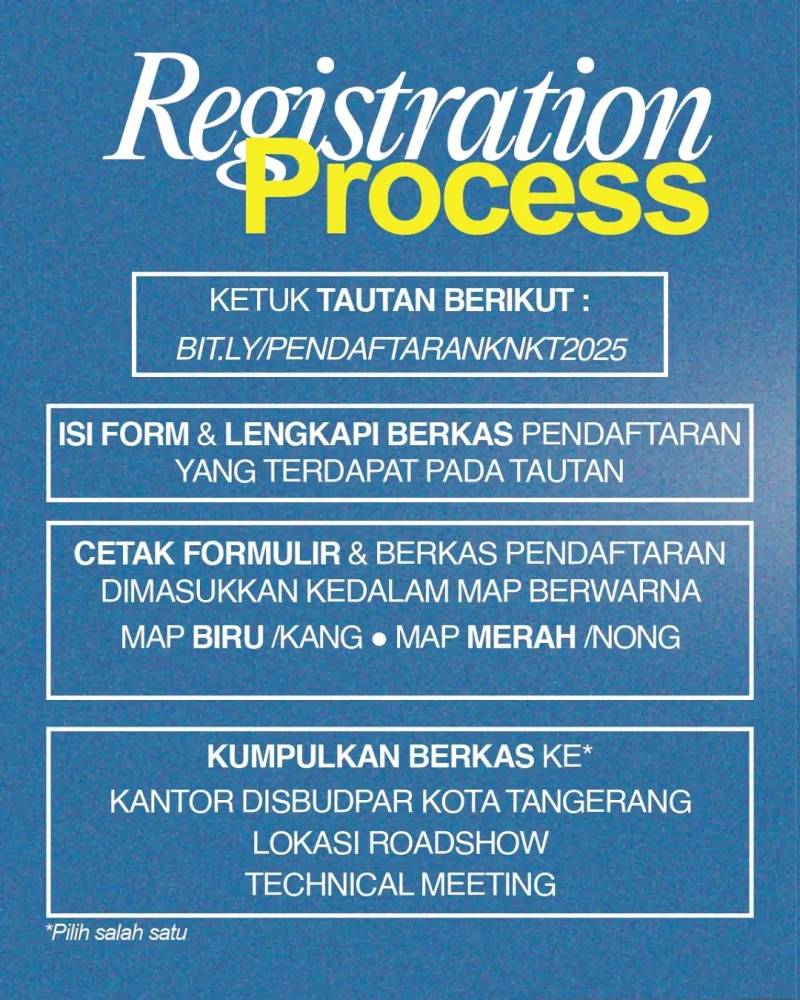 Caranya dimulai dari mengisi formulir pendaftaran dan lengkapi berkas pendaftaran yang tertera pada tautan. Lalu, cetak formulir dan berkas pendaftaran dimasukkan ke dalam map biru untuk Kang dan merah untuk Nong. Kumpulkan berkas ke Kantor Disbudpar Kota Tangerang