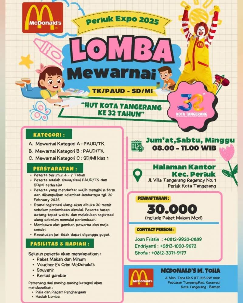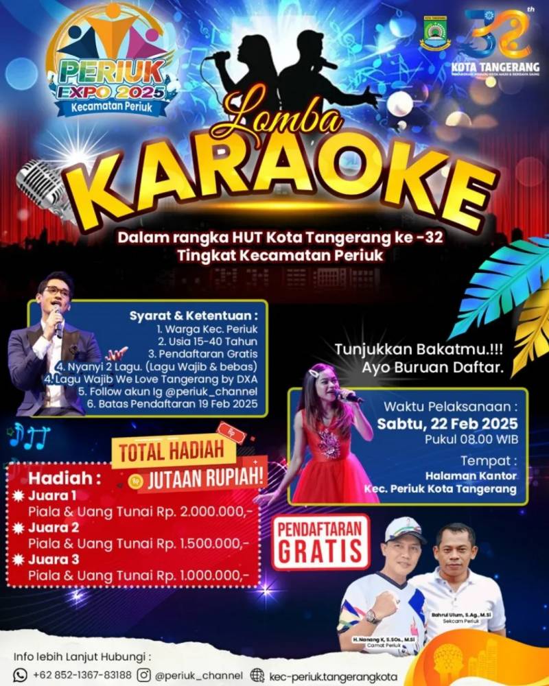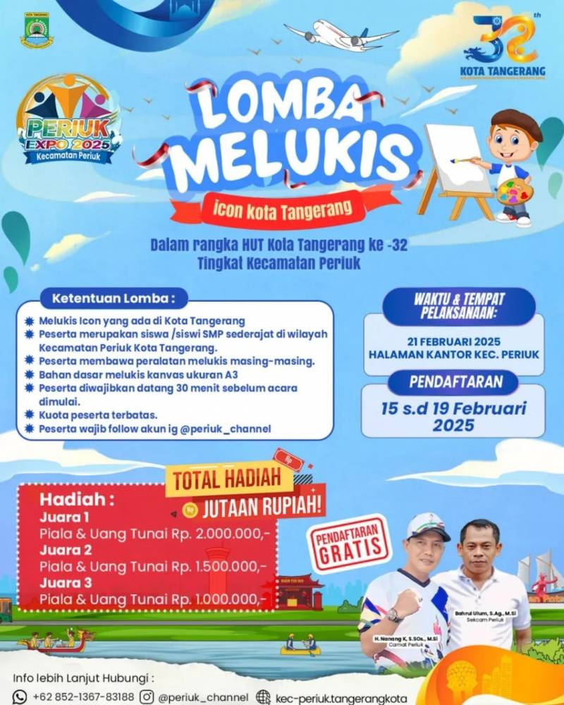 "Acara akan dilaksanakan di Halaman Kantor Kecamatan Periuk dan ada juga pagelaran seni budaya Kota Tangerang. Akan ada banyak kegiatan dan hiburan bagi seluruh warga Kecamatan Periuk untuk menyambut HUT Ke-32 Kota Tangerang," ungkapnya, Senin (17/2/25).