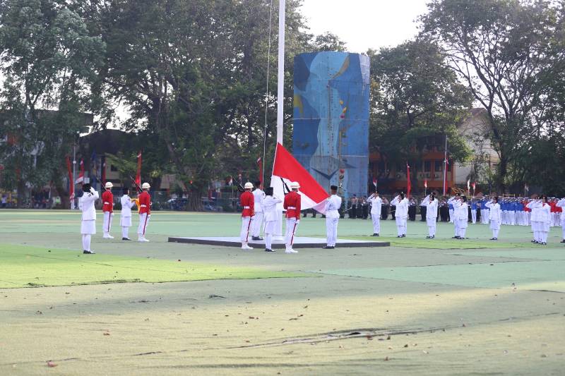 Upacara penurunan Bendera Merah Putih dalam peringatan HUT ke-80 RI berlangsung khidmat dan penuh haru di Lapangan Ahmad Yakni, Kota Tangerang, Minggu (17/8/25). Di balik seragam putih yang gagah, terpancar ekspresi bangga dan mata berkaca-kaca dari para anggota Pasukan Pengibar Bendera Pusaka (Paskibraka).