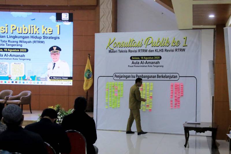 Untuk mewujudkan hal tersebut, Pemerintah Kota (Pemkot) Tangerang melibatkan masyarakat dan berbagai pemangku kepentingan melalui forum diskusi publik yaitu Konsultasi Publik ke-1 terkait Materi Teknis Revisi Rencana Tata Ruang Wilayah (RTRW) dan Kajian Lingkungan Hidup Strategis (KLHS) digelar pada Selasa (19/8/2025) di Aula Al Amanah Puspem.