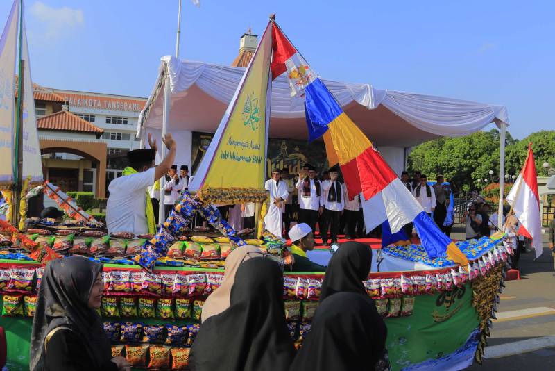 Peringatan Maulid Nabi Muhammad SAW di Kota Tangerang terasa begitu meriah. Ribuan warga tumpah ruah mengikuti arak-arakan Perahu Maulud dan Gunungan hasil bumi, yang dilepas dari Masjid Raya Al-A'zhom hingga berakhir di Masjid Agung Al-Ittihad.