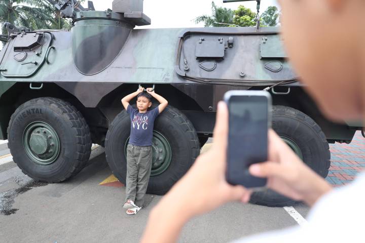 Suasana Taman Elektrik Kota Tangerang semakin meriah. Sore ini, anak-anak sampai masyarakat umum berbondong-bondong mengabadikan momen dengan berfoto ria bersama alutsista Anoa yang dipamerkan.
