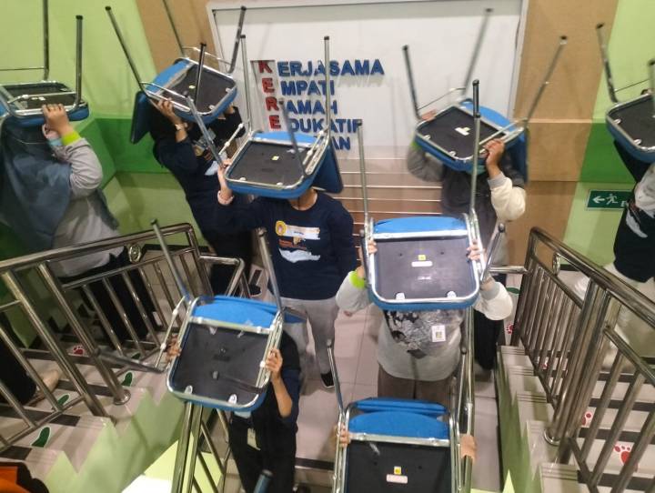 Mulai dari menundukkan tubuh ke lantai, berlindung di bawah benda kokoh, atau melindungi kepala menggunakan tangan kosong. Kemudian melakukan evakuasi terencana dari lantai dua puskesmas menuju titik aman setelah guncangan berhenti.