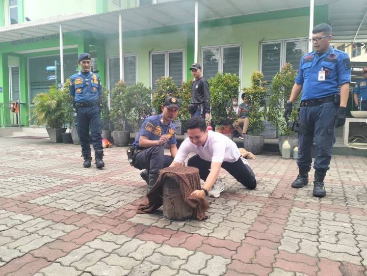 Selain mitigasi gempa, pegawai juga diberikan pelatihan penanganan kebakaran. Fokus utama pelatihan ini adalah penanganan api yang dipicu oleh gas bocor, termasuk cara pemadaman tradisional menggunakan handuk basah.