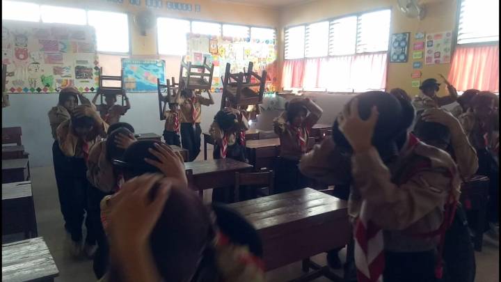 “Jika ada gempa bumi terus ada alarm darurat kita bersembunyi di bawah meja. Jika sudah, guru bilang evakuasi, kita mengangkat bangku, taruh di atas (kepala), terus kita berjalan antre ke bawah ke titik kumpul,” ujar Fatih Alvaro, salah seorang siswa, menjelaskan langkah evakuasi.