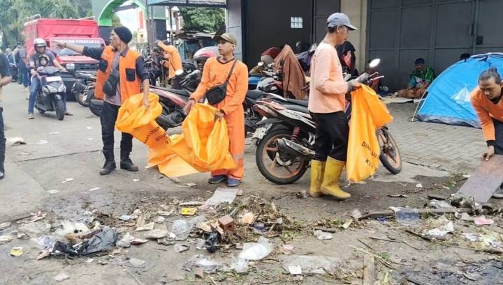 Pasukan Oranye dari DLH Kota Tangerang diterjunkan ke lokasi untuk menyisir sisa-sisa sampah yang terbawa arus maupun sampah rumah tangga yang berserakan. Menggunakan alat manual seperti sapu lidi dan sekop, para petugas bekerja ekstra menaikkan sampah ke truk pengangkut.