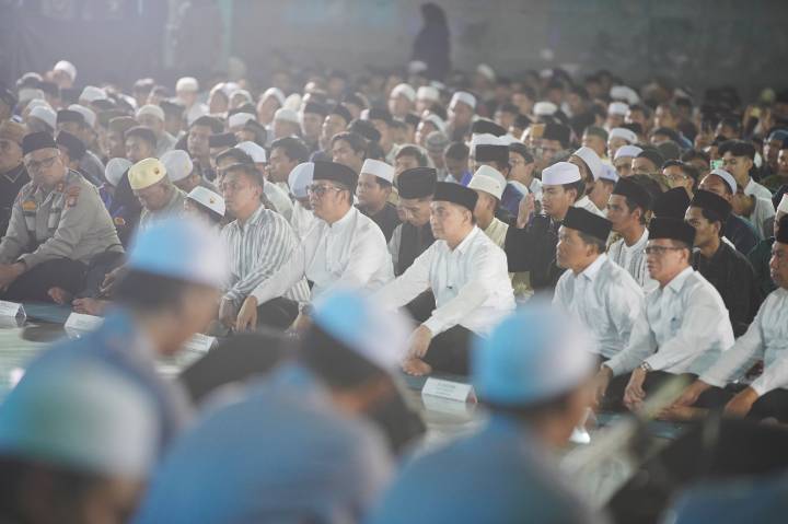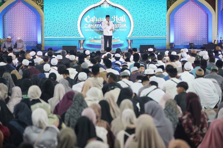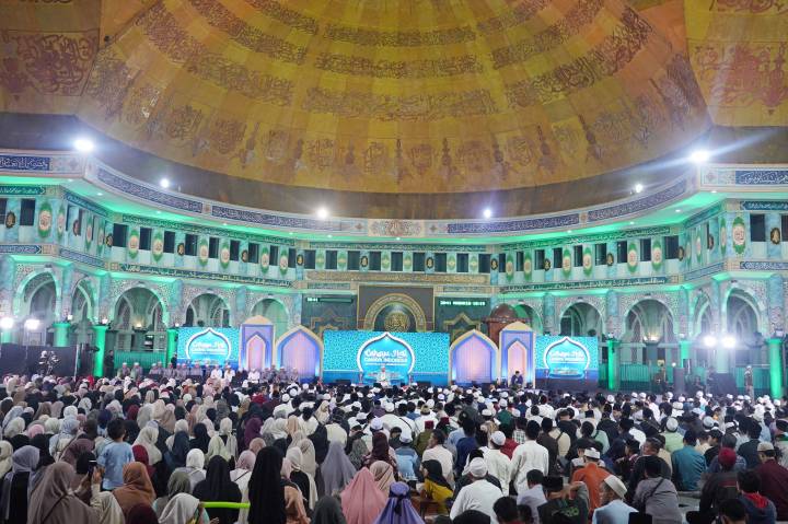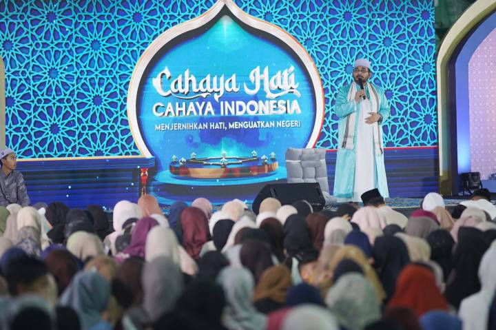 Ribuan jemaah kembali memadati Masjid Raya Al-A'zhom, Kota Tangerang, kali ini dalam kegiatan Cahaya Hati Cahaya Indonesia bertema “Menguatkan Hati, Menguatkan Negeri” yang digelar oleh salah satu stasiun tv nasional, Minggu malam (15/2/2026). Kegiatan ini menjadi bagian dari persiapan spiritual masyarakat dalam menyambut datangnya bulan suci Ramadan.