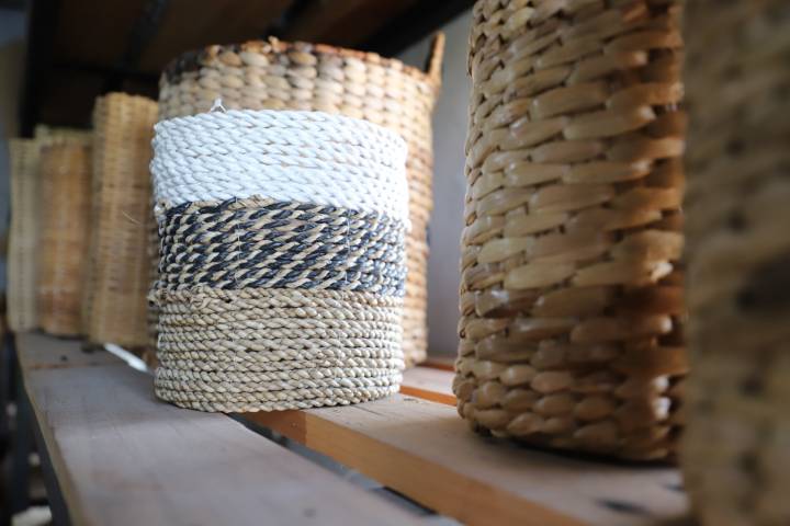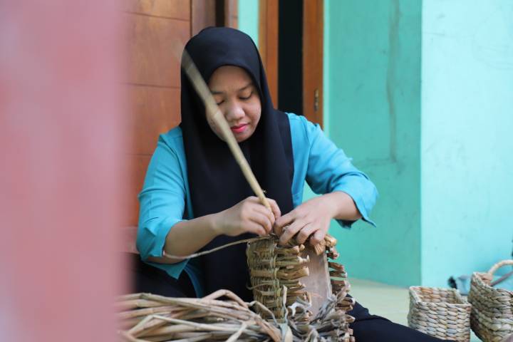 Selain eceng gondok, Ratu Eceng juga menunjukkan inovasinya dengan menyediakan kerajinan dari material pandan, pelepah pisang, dan rotan untuk memenuhi selera pasar internasional yang dinamis.
