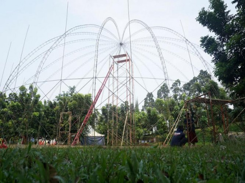 Terlihat sejumlah pekerja sedang mengelas tiang-tiang membentuk kerangka taman kupu-kupu dan pekerja lainnya memadatkan tanah pada taman kelinci.