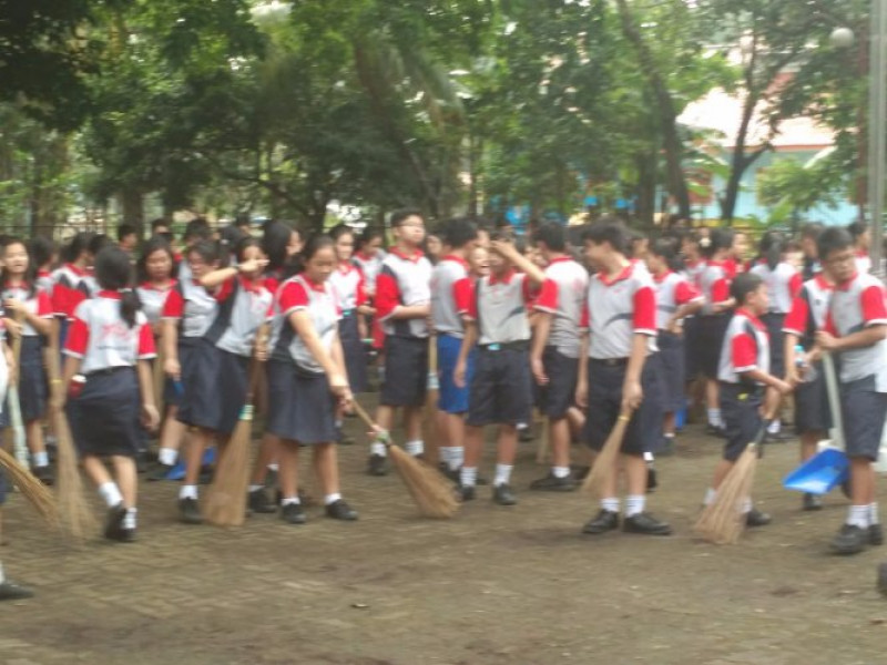 Ratusan pelajar SMP Strada Santa Maria 1 kota Tangerang melakukan kegiatan bersih-bersih di Taman Makam Pahlawan Taruna dan lapangan Ahmad Yani. Selasa (1/8)