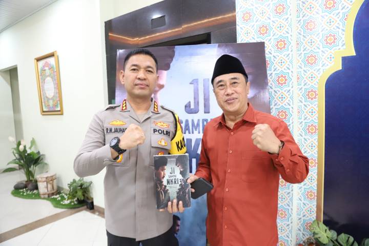 Kapolres Metro Tangerang Kombes Pol Raden Muhammad Jauhari (kiri) dan Ketua MUI Kota Tangerang KH. Ahmad Baijuri Khotib (kanan) menerima Buku JI Sampai NKRI, di Aula MUI Kota Tangerang, Kamis (19/9/2025).