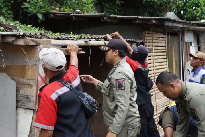 Petugas Trantib Kecamatan Cibodas membersihkan bangunan liar di Jalan Bango Raya, Kelurahan Cibodasi, Kecamatan Cibodas, Kota Tangerang, Jumat (9/1/26).