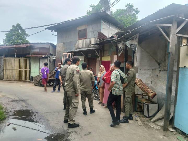 Petugas Trantib Kecamatan Cibodas berkoordinasi dengan warga setempat, terkait penertiban bangunan liar di Jalan Bango Raya, Kelurahan Cibodari, Kecamatan Cibodas, Kota Tangerang, Jumat (9/1/26).