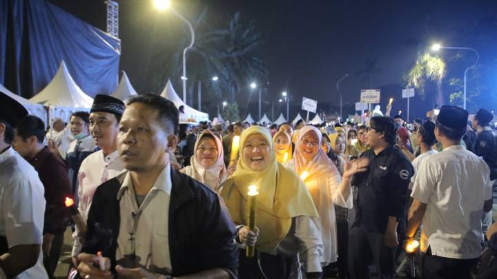 Suasana kemeriahan Pawai Obor, rangkaian Festival Maulid Nusantara 2, di Taman Elektrik, Kota Tangerang, Provinsi Banten, Selasa (23/9/25).