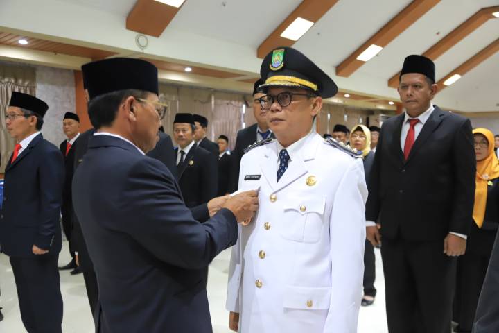 Wali Kota Tangerang Sachrudin menyematkan lencana kepada Camat Cibodas Ahmad Suhendar, di Aula Al Amanah, Gedung Pusat Pemerintahan Kota Tangerang, Banten, Senin (27/10/2025).