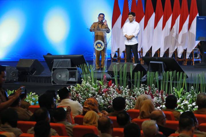 Gubernur Banten, Andra Soni, didampingi Wakilnya, Dimyati, menyampaikan laporan pelaksanaan dan operasional MBG di wilayah Propinsi Banten