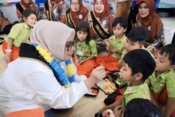 Ketua Pokja Bunda PAUD Kota Tangerang Rini Rizqiyya Maryono, sedang menyuapi santapan makanan Beragam, Bergizi, Seimbang dan Aman (B2SA), di TK Pembina, Kecamatan Pinang, Kota Tangerang, Provinsi Banten, Jumat (26/9/25).