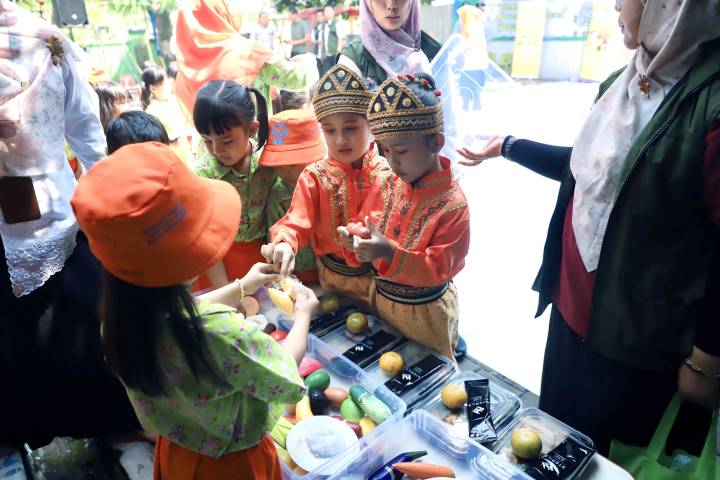 Murid TK Pembina sedang praktik menyusun makanan yang mengandung Beragam, Bergizi, Seimbang, dan Aman (B2SA), di TK Pembina, Kecamatan Pinang, Kota Tangerang, Provinsi Banten, Jumat (26/9/25).