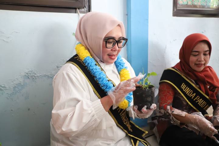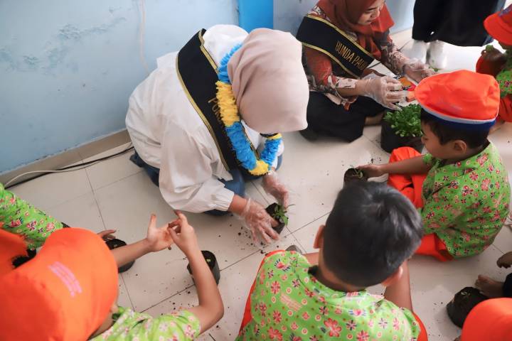 Ketua Pokja Bunda Paud Kota Tangerang Rini Rizqiyya Maryono, melakukan penanaman bersama bibit terong bersama Murid TK Pembina, di halaman TK Pembina, Kecamatan Pinang, Kota Tangerang, Provinsi Banten, Jumat (26/9/25).