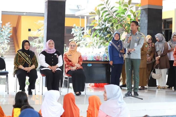 Kepala BPBD Kota Tangerang Mahdiar (berdiri) didampingi Bunda PAUD Kota Tangerang Masturoh Sachrudin ( kiri) dan Wakil Bunda PAUD Rini Rizqiyya Maryono memberikan sambut dalam acara kunjungan Bunda PAUD ke Kantor BPBD Kota Tangerang, Selasa (16/9/2025).