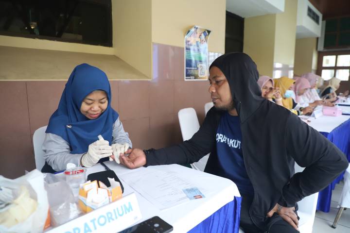 Salah seorang jurnalis tengah melakukan pengambilan sampel darah dalam kegiatan Cek Kesehatan Gratis (CKG) yang digelardi Ruang Patio, Pusat Pemerintahan Kota Tangerang, Provinsi Banten, Kamis (11/9/25).