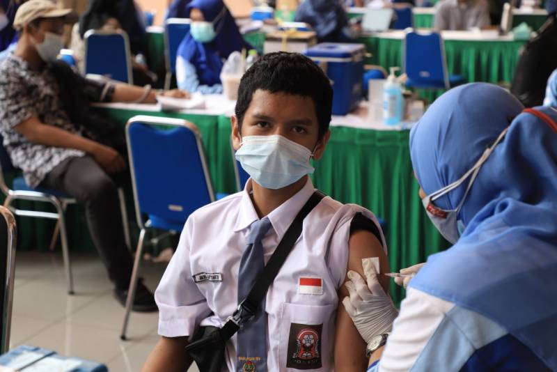 Antusias lebih tinggi terlihat dihari kedua pelaksanaan vaksinasi massal pelajar Kota Tangerang, di Puspem Kota Tangerang, Kamis (2/9/21). Diketahui, pada hari...