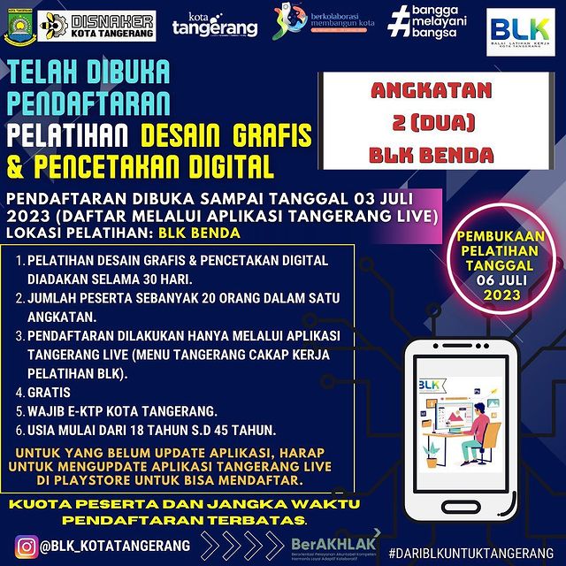 Balai Latihan Kerja (BLK) Kota Tangerang kembali membuka pendaftaran pelatihan berbasis kompetensi (PBK) Angkatan II hingga 3 Juli mendatang. Pendaftaran bisa...