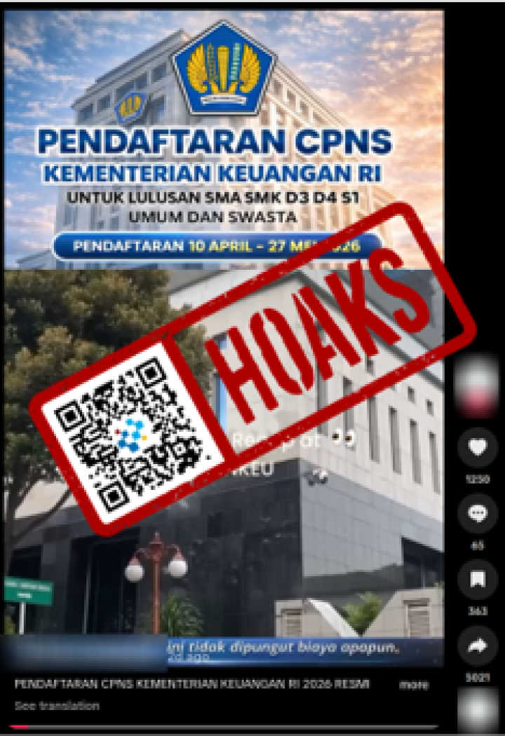 Beredar di media sosial TikTok, unggahan yang diklaim berisi informasi pembukaan pendaftaran Calon Pegawai Negeri Sipil (CPNS) Kementerian Lingkungan Hidup dan Kehutanan (KLHK) tahun 2026. Unggahan tersebut disertai dengan tautan pendaftaran.
