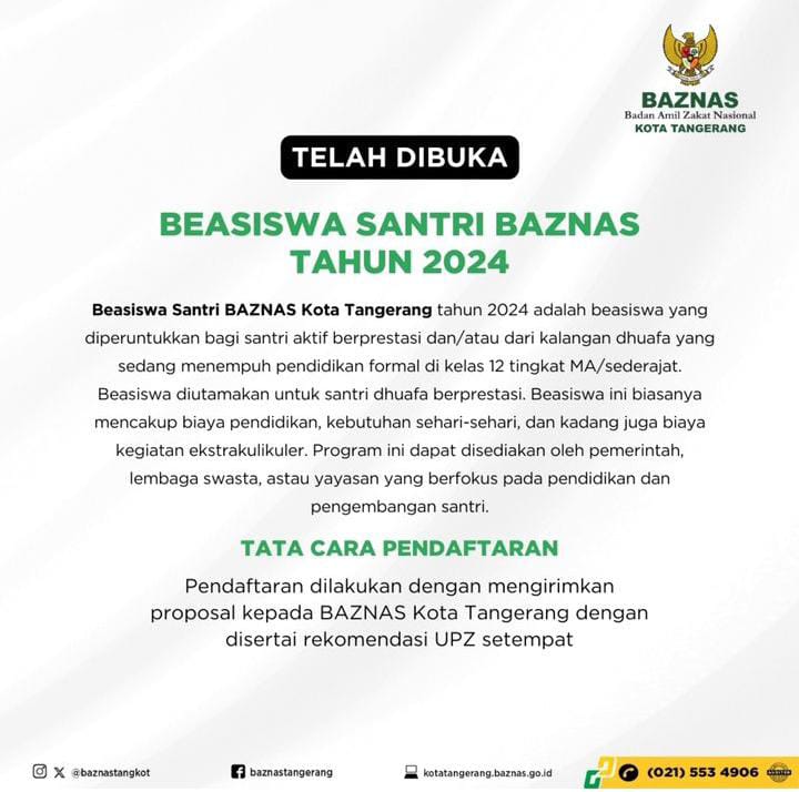 Badan Amil Zakat Nasional(BAZNAS) Kota Tangerang membuka pendaftaran beasiswa santri BAZNAS Kota Tangerang tahun 2024.