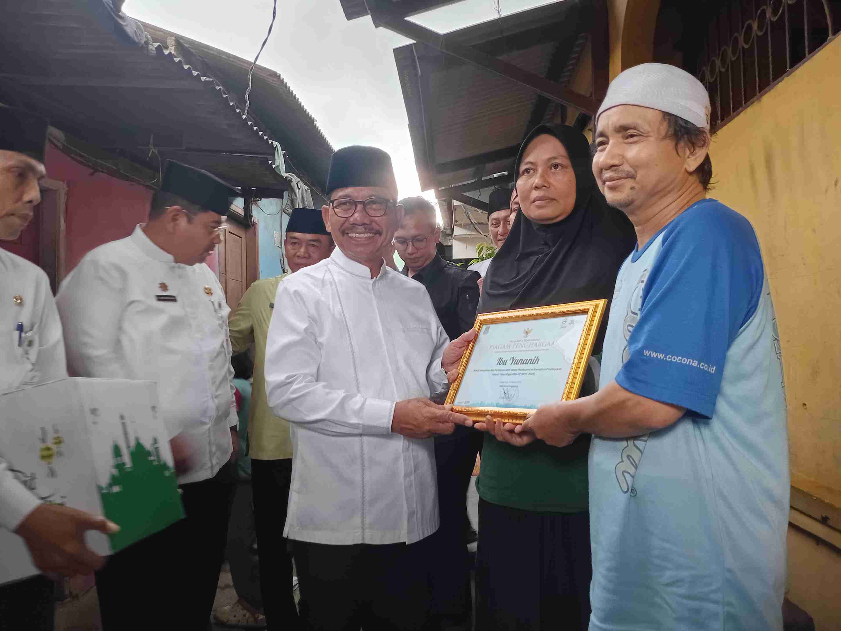 Wali Kota Tangerang, Sachrudin, memberikan penghargaan kepada Yunanih, warga Kelurahan Kenanga, Kecamatan Cipondoh, yang menunjukkan dedikasi luar biasa dalam memenuhi...