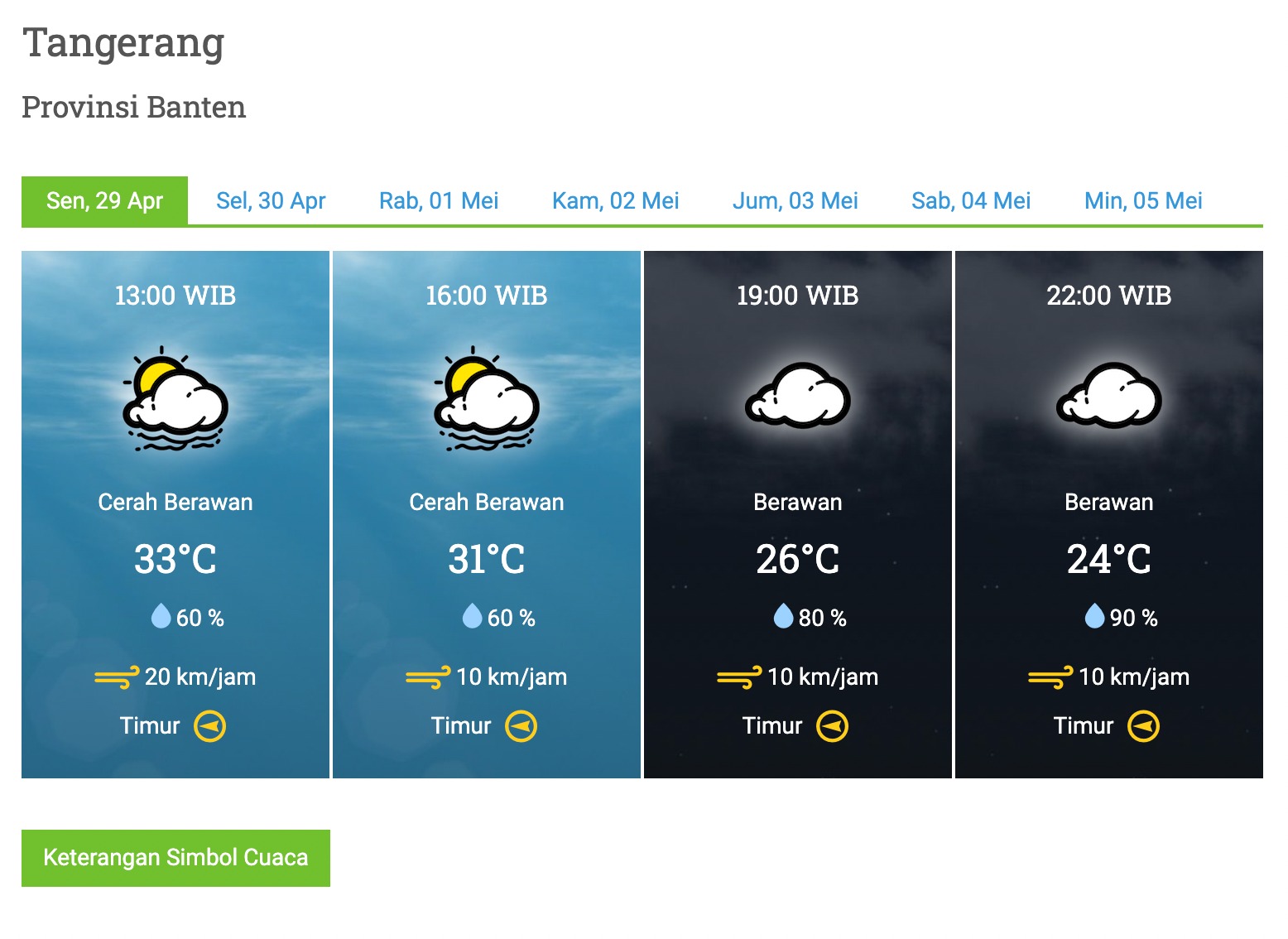 Berdasarkan laman Badan Meteorologi, Klimatologi dan Geofisika (BMKG) Kelas I Tangerang, cuaca seminggu ke depan Kota Tangerang diprediksi didominasi cerah...