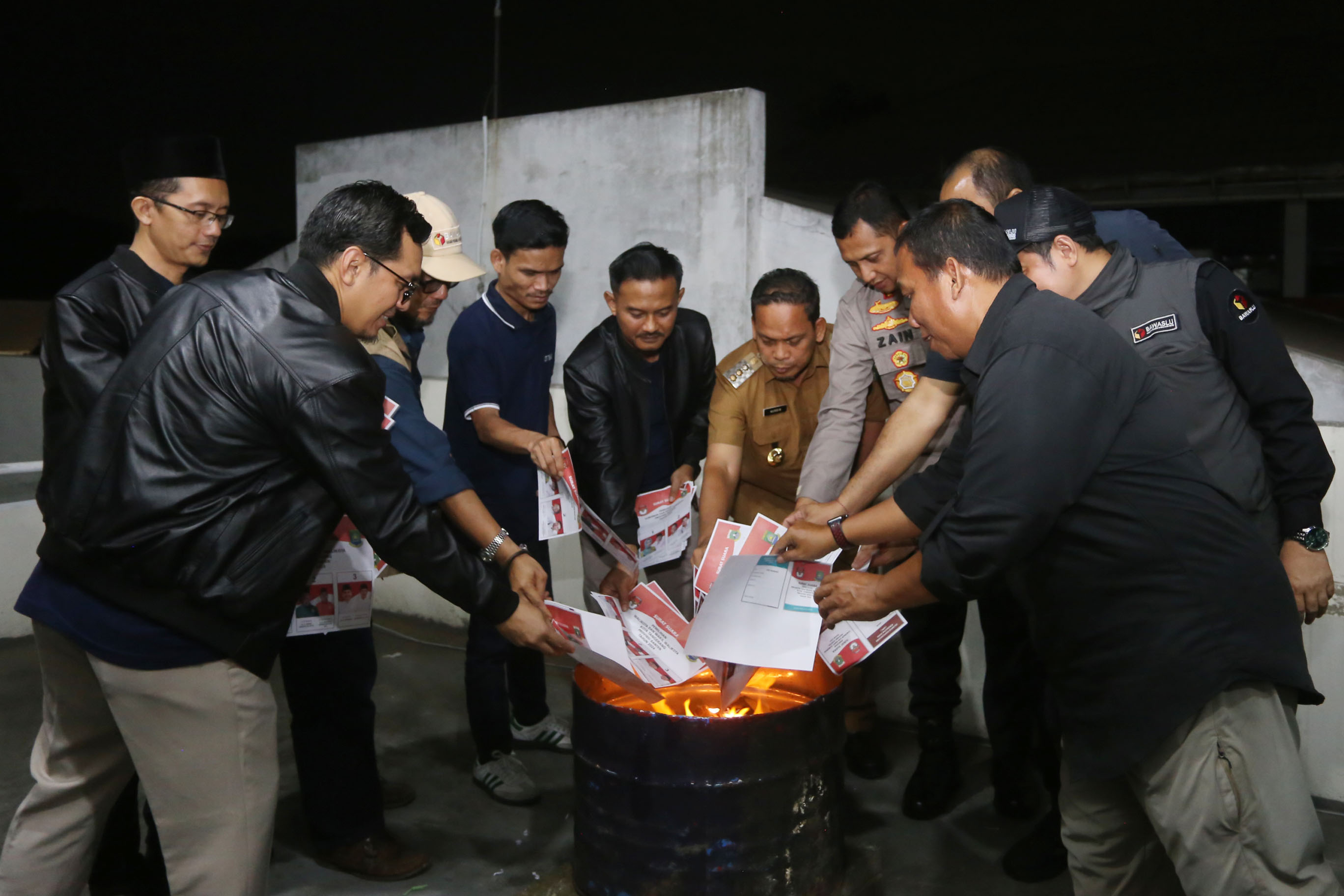 Penjabat (Pj) Wali Kota Tangerang Doktor Nurdin bersama dengan jajaran Forkopimda Kota Tangerang menyaksikan pemusnahan surat suara yang tersisa atau...