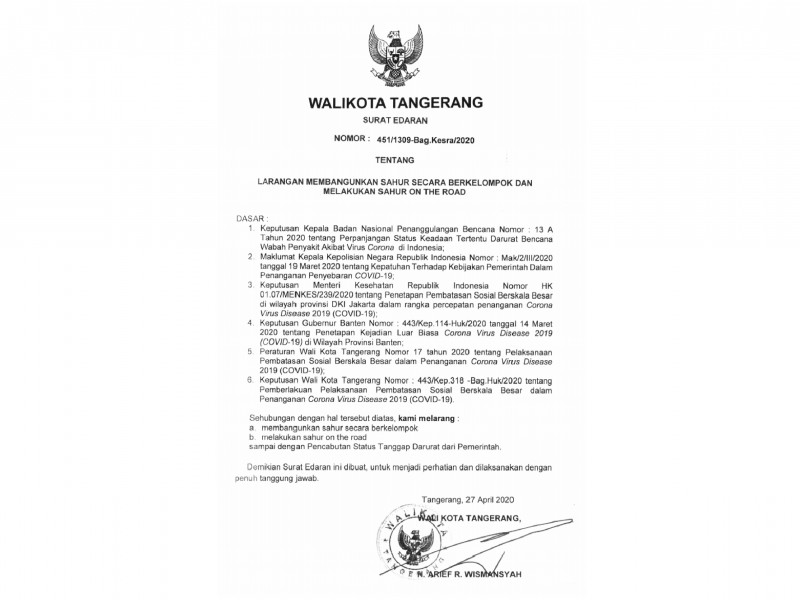 <p>Untuk menghentikan penyebaran pandemi Covid-19, Pemerintah Kota (Pemkot) Tangerang melarang warganya melakukan aktivitas membangunkan sahur secara berkelompok...