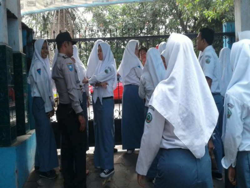 Sambangi Para Siswi SMK Karya Bangsa di saat bubaran sekolah, Aiptu Slamet berbincang dengan santai sambil menyampaikan beberapa pesan Kamtibmas Kepada Para Siswi SMK Karya Bangsa.