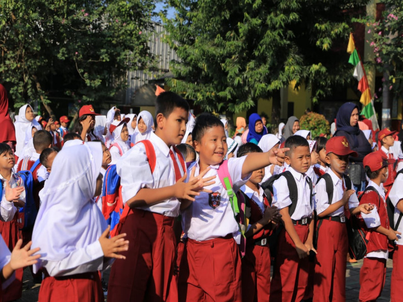 Berbagai keunikan berlangsung saat prosesi penyambutan siswa baru di SD Negeri Uwung Jaya, Senin (16/7/2018). Para siswa ditugaskan untuk mengenakan seragam sekolahnya masing-masing.
