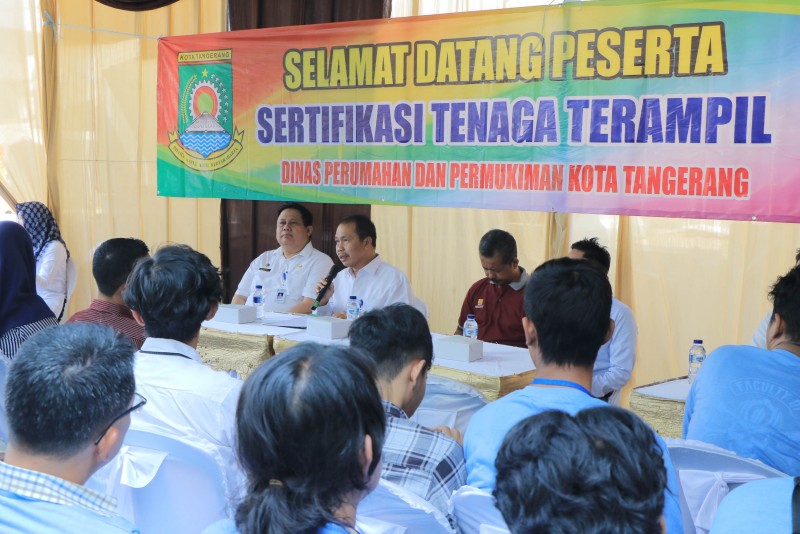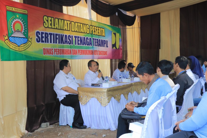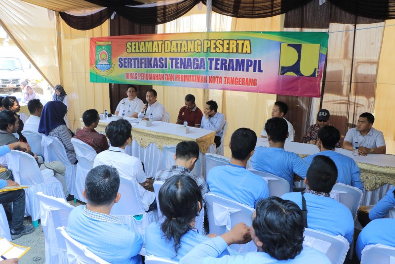 Pemerintah Kota Tangerang menggelar kegiatan Fasilitasi Sertifikasi Tenaga Kerja Konstruksi yang diinisiasi oleh Dinas Perumahan dan Permukiman Kota Tangerang yang digelar di lapangan belakang Mall Pelayanan Publik, Rabu (24/07).