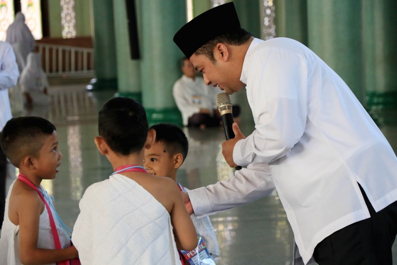 Pada kesempatan tersebut, Arief juga berinteraksi dengan anak - anak untuk melantunkan Talbiah secara lantang.