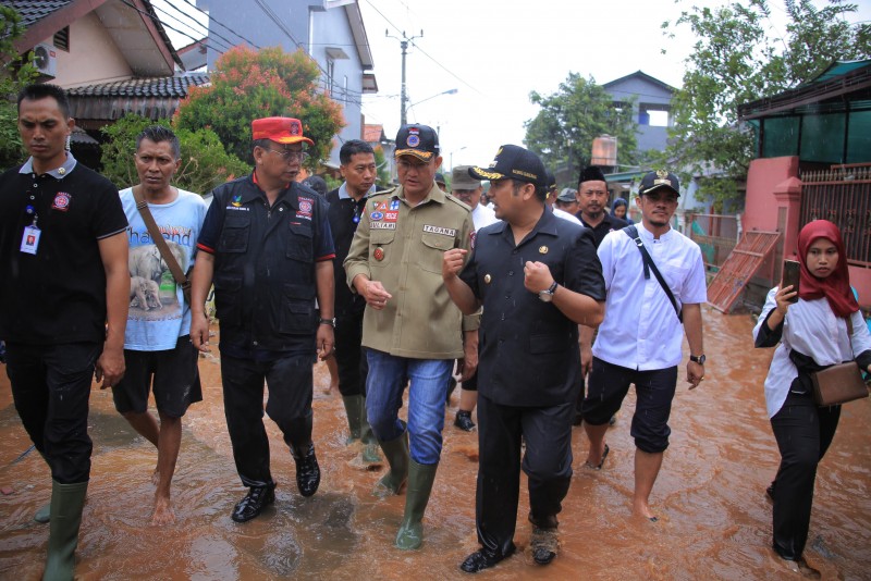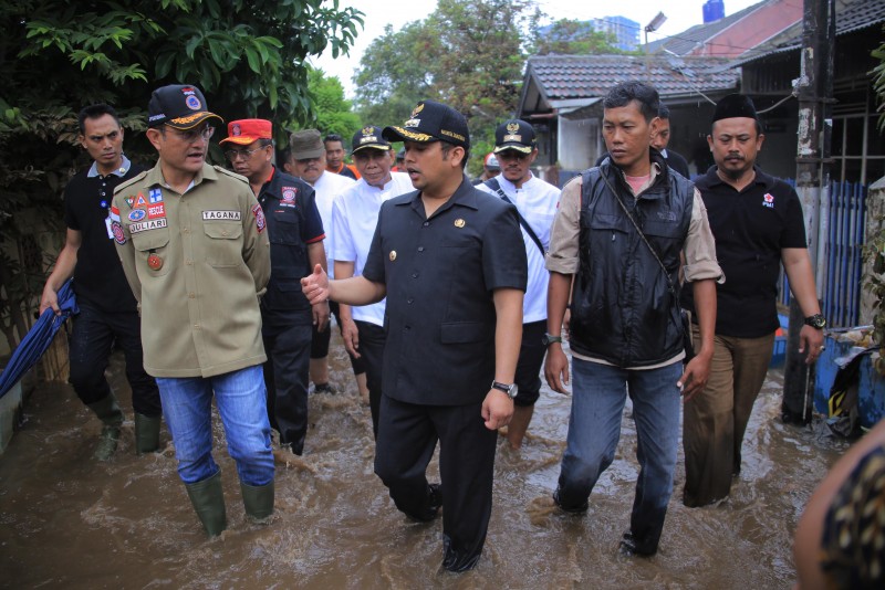Wali Kota Tangerang Arief Wismansyah bersama Menteri Sosial Juliari P. Batubara mendatangi wilayah Ciledug Indah untuk memberikan bantuan langsung kepada korban yang terdampak banjir, Jum'at (3/1/2020).