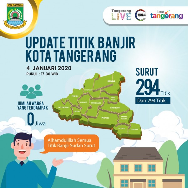 Musibah banjir sempat melanda 294 titik di Kota Tangerang, sejak Rabu (1/1). Banjir tersebut kini dilaporkan sudah surut 100 persen. Kepala Diskominfo, Mulyani menyatakan banjir dengan ketinggian 15 hingga 130 cm dengan 16.994 warga yang terdampak, kini sudah dinyatakan surut 100 persen, berdasarkan data per pukul 17.30, Sabtu (4/1/20).