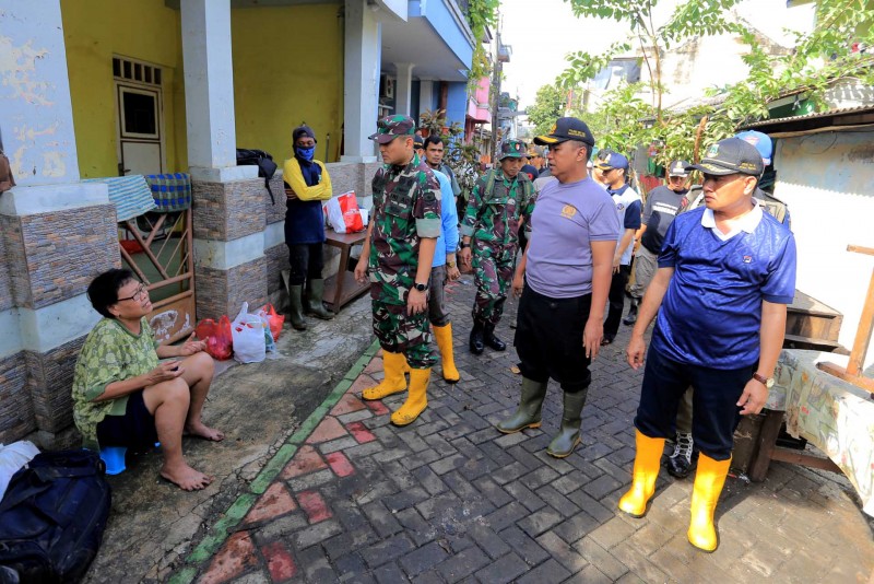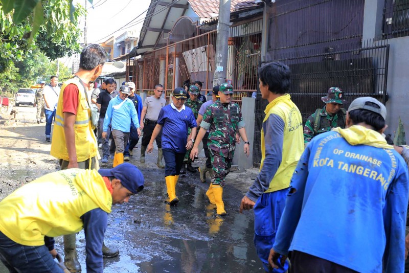 Herman yang juga datang bersama Dandim 0506/Tgr Wisnu Kurniawan dan Kapolres Metro Tangerang Kota Sugeng Hariyanto tampak membersihkan sampah pasca banjir.
