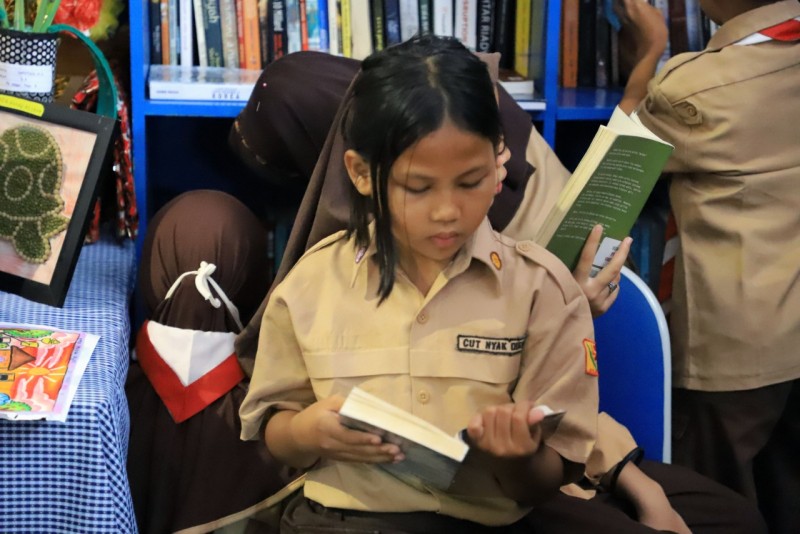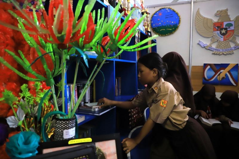 Stan Pojok Baca Dindik, salah satu stan yang memiliki daya tarik tersendiri. Terlebih bagi ratusan pelajar yang tak henti meramaikan stan Pojok Baca sejak pagi hingga sore.