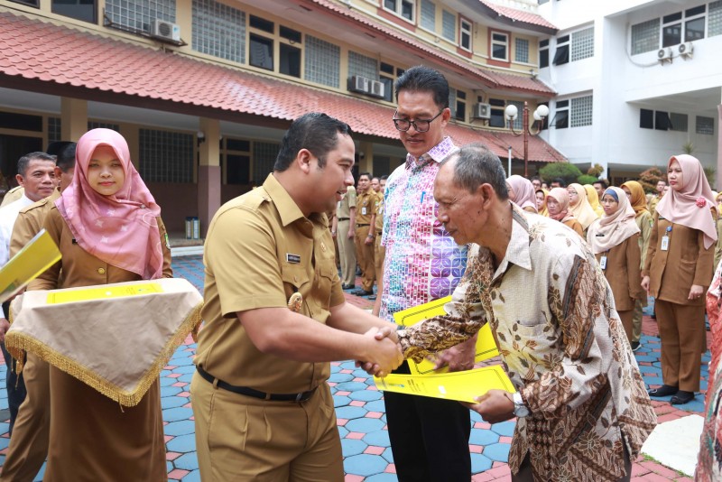 Sebagai informasi, diberikan juga SK Pensiun kepada sembilan orang PNS yang telah memasuki masa purna bakti salah satunya Camat Larangan H. Dimyati.
