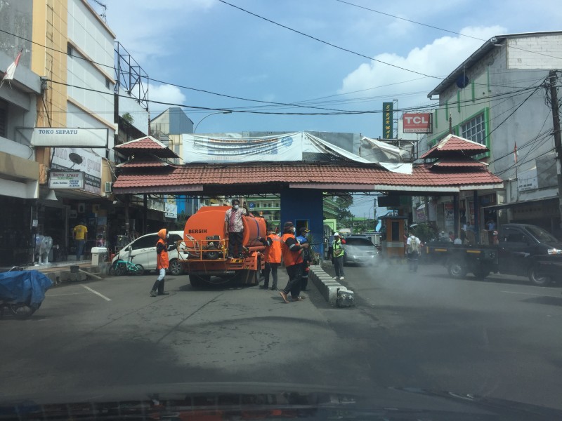 Sejumlah mobil truk milik Dinas Lingkungan Hidup Kota Tangerang terlihat sibuk. Ada juga petugas dari Satuan Polisi Pamong Praja (Satpol PP) yang mengikuti laju truk tersebut. Di belakangnya ada petugas yang terlihat menyemprotkan cairan.