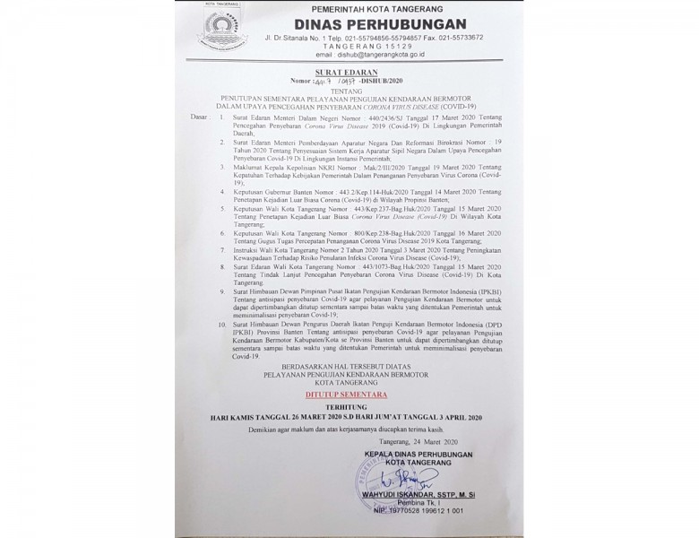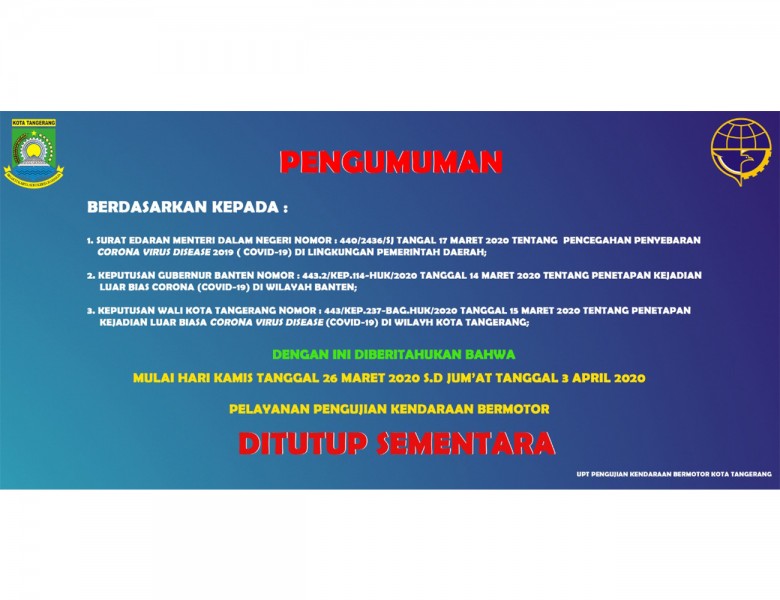 Pemerintah Kota (Pemkot) Tangerang melalui Dinas Perhubungan (Dishub) Kota Tangerang, telah mengeluarkan surat edaran tentang penutupan sementara pelayanan Pengujian Kendaraan Bermotor (PKB) dalam upaya pencegahan penyebaran Virus Corona (Covid – 19).