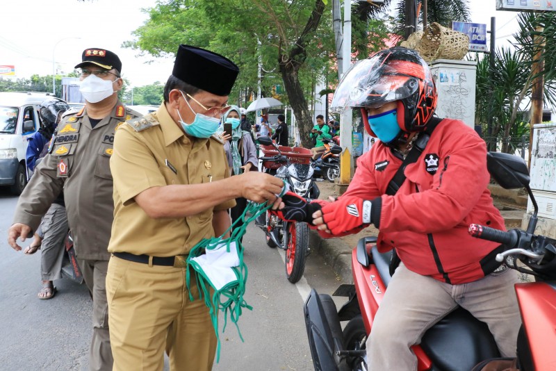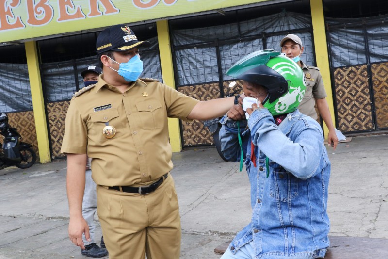 "Ini pak dipakai ya maskernya," kata Sachrudin sembari memberikan masker kepada beberapa tukang ojek.