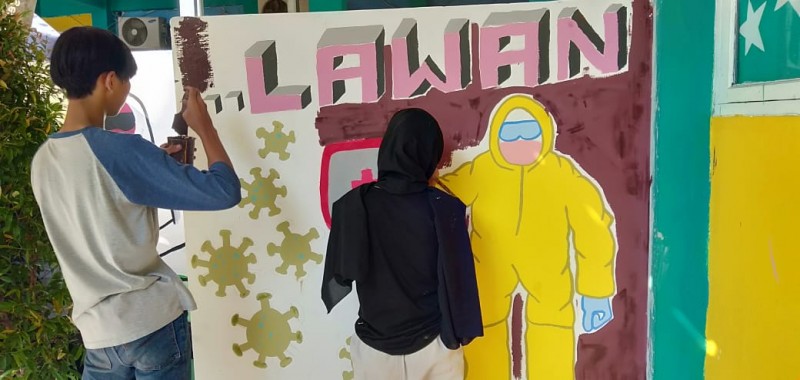 Dengan menerapkan protokol kesehatan, belasan siswa sekolah dasar dan menengah ini mulai mengisi kanvas putih berukuran 5X2 meter dengan cat beraneka warna. Di mana, untuk lomba kali ini panitia mengangkat tema memutus mata rantai covid 19.