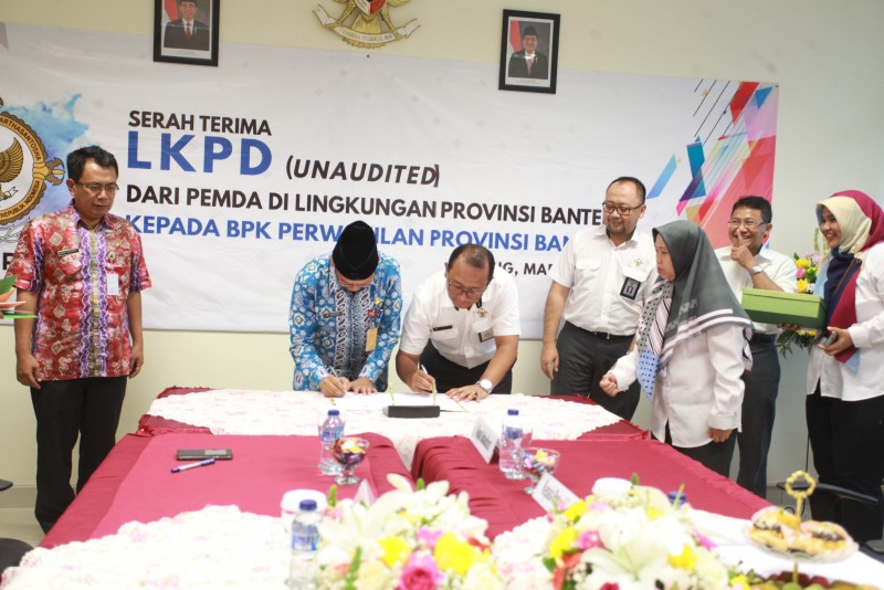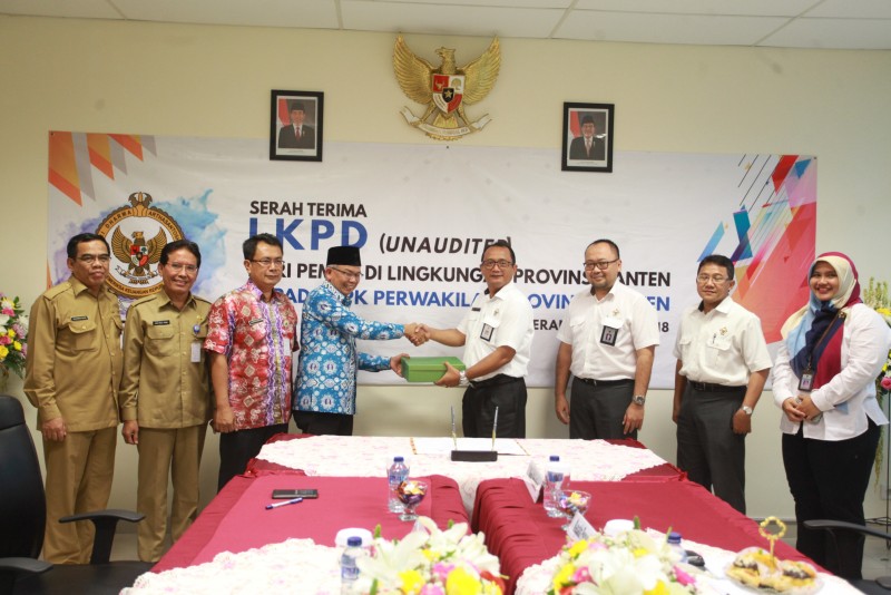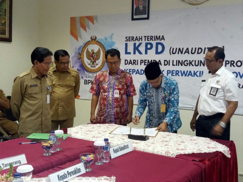 Pemerintah Kota Tangerang menyerahkan Laporan Keuangan Pemerintah Daerah (LKPD) Kota Tangerang Tahun 2017 kepada Badan Pemeriksa Keuangan (BPK) RI Perwakilan Provinsi Banten di Aula Gedung BPK RI Perwakilan Banten, di Palima, Kecamatan Pabuaran, Kabupaten Serang, Senin (26/03/2018).